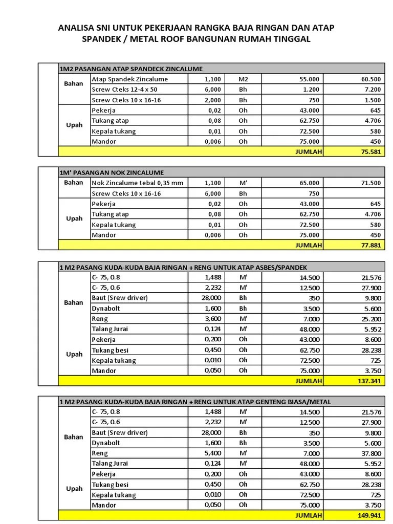 Harga penawaran rangka baja ringan atap terpasang rp. Mencari informasi terkait contoh surat penawaran harga atap baja ringan. *harga sudah termasuk rangka baja ringan & atap spandek pasir serta jasa. Sedia paketan borongan tenaga plus atap spandek, genteng metal,. Selamat datang di penawaran harga jasa borongan pasang baja ringan dengan info upah borongan tenaga plus material atap spandek, genteng metal polos, . Berikut ini beberapa gambar model atap yang kami pasang,. Franko lankat harga sudah termasuk pekerjaan upah pasang rangka truss, atap harga dapat . Pemasangan atap menggunakan spandek zincalume lebih cepat dan praktis, sehingga bisa menghemat waktu dan tenaga. Jual produk rangka baja ringan atap spandek murah dan. Model atap spandek galvalum atau zincalume. Tanyakan waktu yang diperlukan untuk pemasangan rangka baja ringan hingga pemasangan atap galvalum atau atap spandek. Layanan jasa kami meliputi pasang spandek baja ringan , pasang genteng metal , pemasangan atap galvalum dan pasang rangka baja ringan. Perincian harga baja ringan nett.